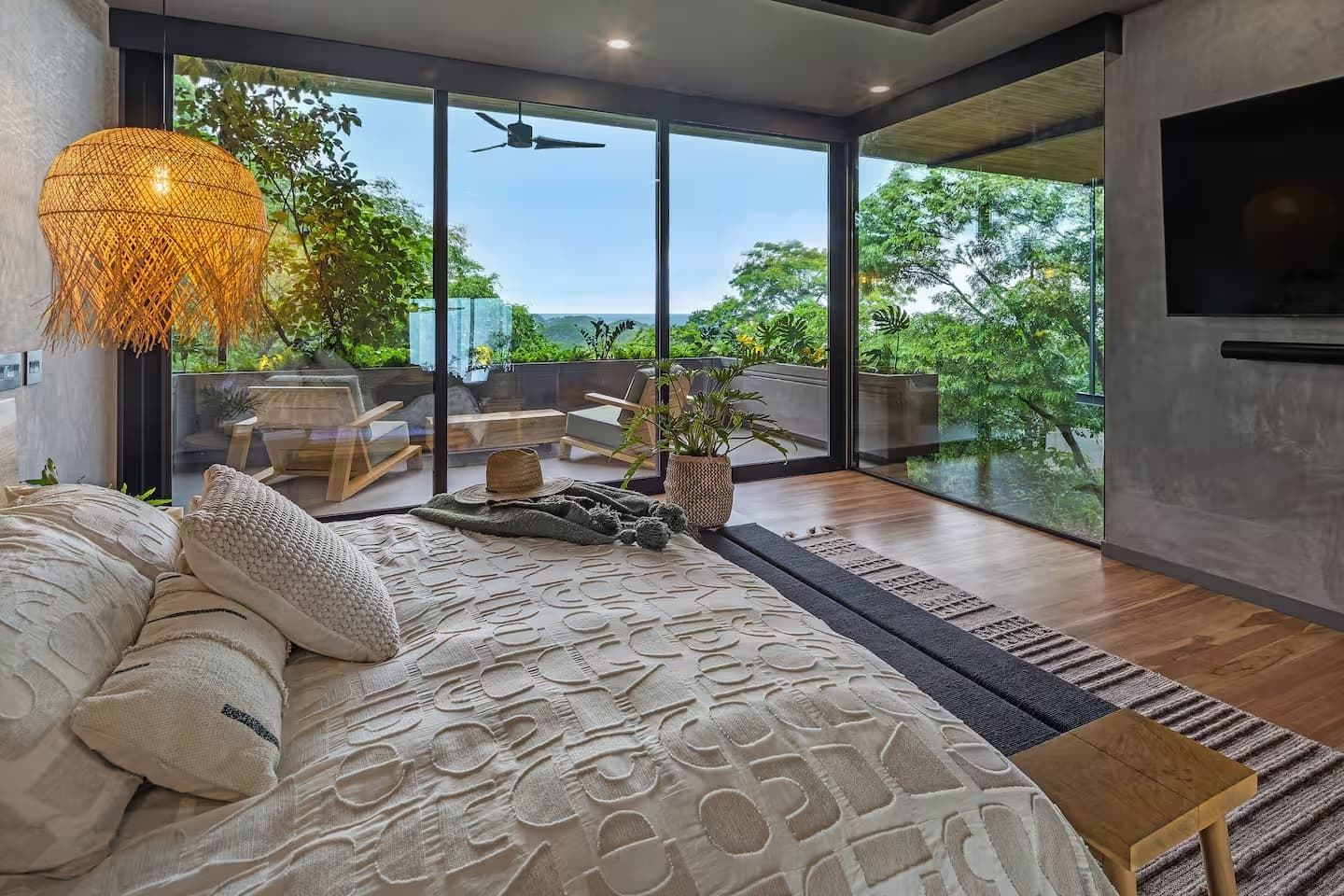 Private Terrace: Floor-to-ceiling glass doors open to a large terrace with jungle and seasonal ocean views, complete with screened panels to let in the breeze.